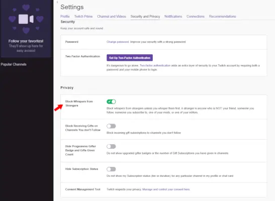 Els usuaris poden parlar entre ells en privat mitjançant la funció 'Xuxiueig', la versió de Twitch de missatgeria privada o directa. Hi ha configuracions de privadesa a Twitch que us permeten bloquejar missatges privats o xiuxiueigs que us envien des de desconeguts.