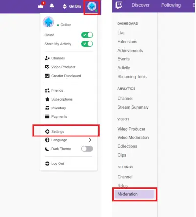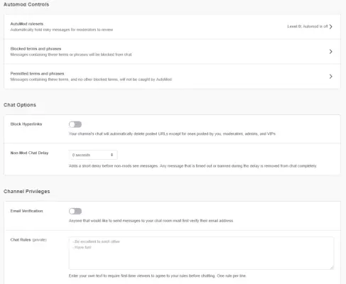 Quan configuren una reproducció en directe, els usuaris poden ajustar la configuració per filtrar o moderar l'idioma que s'utilitza a la seva sala de xat. S'hi pot accedir a través de la 'configuració' del compte d'un usuari.