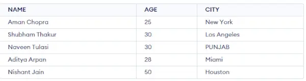 CREATE TABLE demo_table( NAME VARCHAR (20), AGE INT , CITY VARCHAR(20) ); INSERT INTO demo_table (NAME, AGE, CITY) VALUES ('Aman Chopra', 25, 'New York'), ('Shubham Thakur', 30, 'Los Angeles'), ('Naveen Tulasi', 45, 'Chicago'), ('Aditya Arpan', 28, 'Miami'), ('Nishant Jain', 50, 'Houston');>