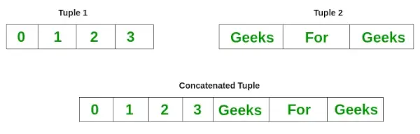 # Concatenation of tuples Tuple1 = (0, 1, 2, 3) Tuple2 = ('Geeks', 'For', 'Geeks') Tuple3 = Tuple1 + Tuple2 # Printing first Tuple print('Tuple 1: ') print(Tuple1) # Printing Second Tuple print('